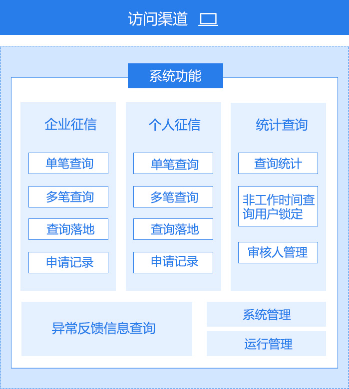 完成个人征信报告和企业征信报告查询申请处理和进度查询,可以进行单笔或者批量查询以及查询授权书的上传、保存,在查询的过程中可选择查询报告主要内容或者报告所有内容。